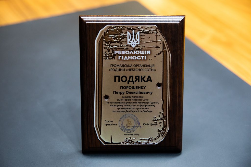 Она также вручила Петру Порошенко благодарность за искреннюю поддержку семей Героев Небесной Сотни и пострадавших участников Революции Достоинства, многолетнее сотрудничество в сфере развития гражданского общества и по случаю Дня Достоинства и Свободы.