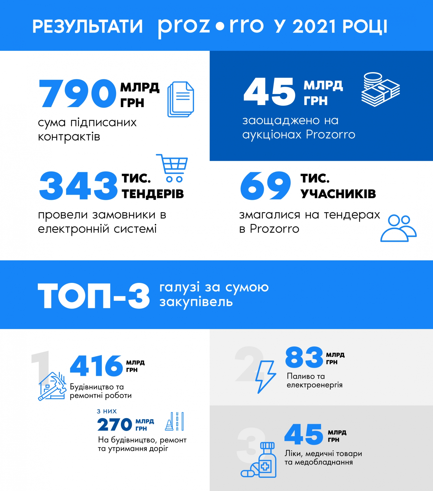 По результатам проведенных тендеров в электронной системе публичных закупок Prozorro в 2021 году государство подписало контракты на 790 миллиардов гривень, из которых 416 миллиардов — в сфере строительства и ремонтных работ.
