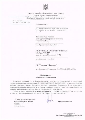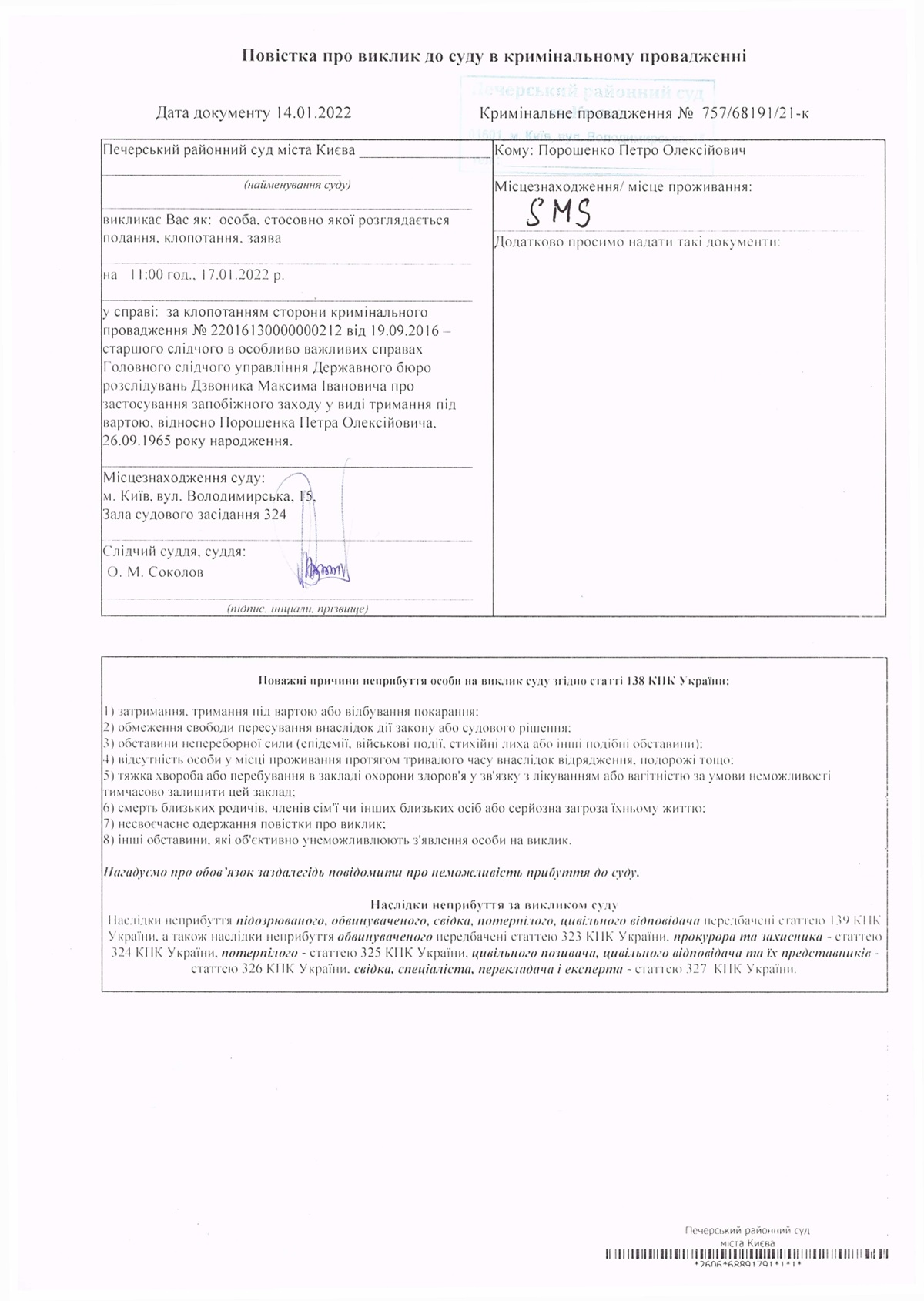 — 17 января 2022 в 11:00 будет рассмотрено ходатайство об избрании в виде содержания под стражей в отношении Порошенко Петра Алексеевича, — говорится в сообщении.