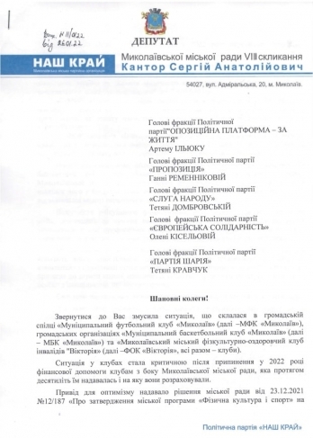 Депутат Николаевского горсовета Сергей Кантор письменно обратился к главам фракций по поводу возобновления финансирования городских спортивных клубов.