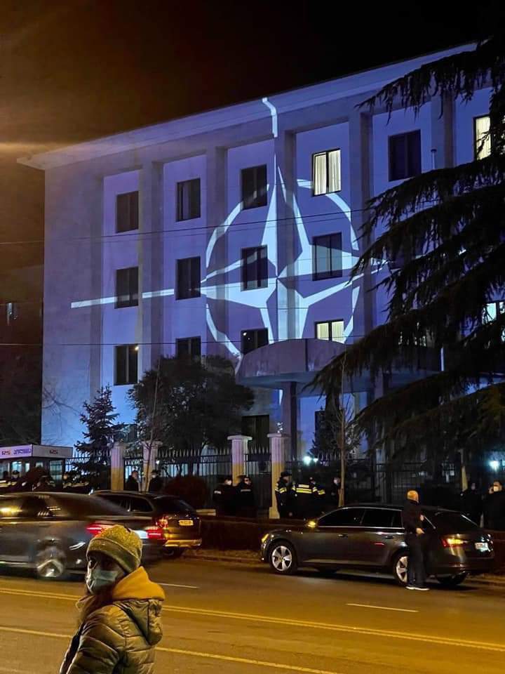 Украинский флаг на здание поместили с помощью проектора. А чтобы «добить» россиян, грузины добавили еще изображение эмблемы НАТО. И все это — на фоне звучания украинского гимна, отмечает канал.