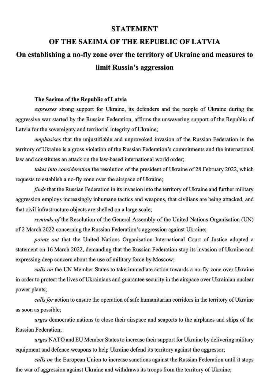 Парламент Латвии единогласно призвал страны ООН принять меры по закрытию неба Украины от российских оккупантов. Ранее с подобными заявлениями официально выступили Литва и Эстония.