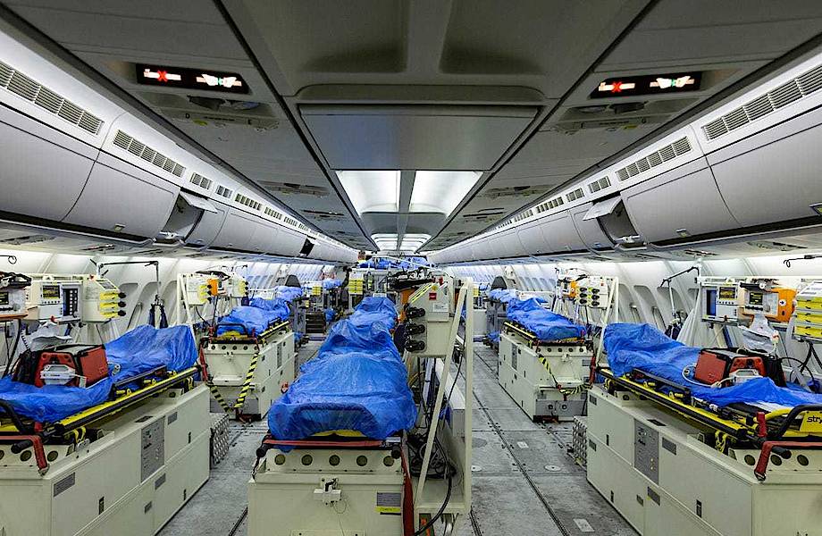 Внутри медицинского самолета могут разместиться до 56 раненых детей и взрослых. В другом случае в «госпитале» могут находиться шесть модулей для интенсивной терапии и 38 мест для людей с менее серьезными травмами.