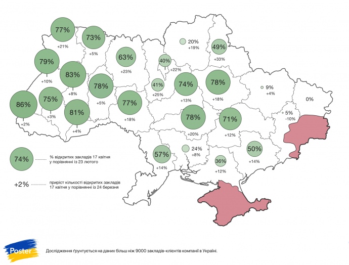 Менее чем за месяц количество открытых заведений в Черниговской области выросло с 1% до 20%, в Сумской – с 16% до 49% клиентов Poster по сравнению с довоенным показателем.
