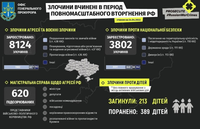 09:01 По состоянию на 24 апреля с начала войны погибли 213 детей, еще 389 получили ранения.