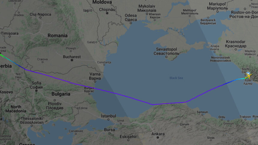 — По данным сайта flyradar24.com, самолет с идентификационным номером RSD86 вылетел сегодня из Сочи около 8:00 и приземлился в аэропорту Белграда сегодня около 9:30. Он вылетел из Белграда около 13:30. Как сообщает flyradar24.com, самолет принадлежит «Особому летному отряду России», который обслуживает президента и правительство России. Как сообщает сербский ресурс N1, информации о таком рейсе в аэропорту Никола Тесла в Белграде не было, но в Instagram были выложены фотографии самолета, — пишут болгарские журналисты.