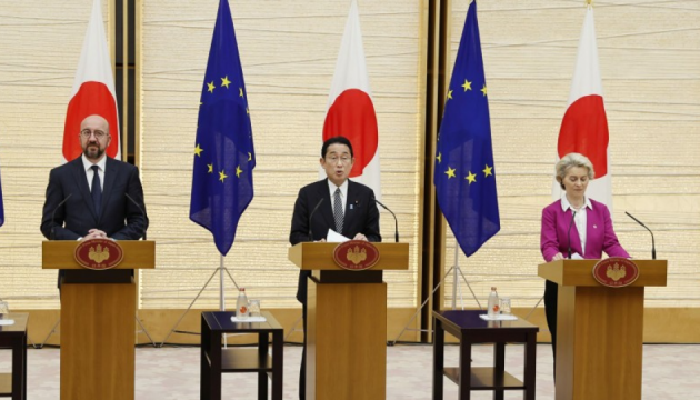 Европейский Союз и Япония, которые провели встречу на высшем уровне в Токио, обратились к российской федерации с требованием немедленно и без дополнительных условий прекратить неспровоцированную агрессию против Украины и вывести войска с ее территории.