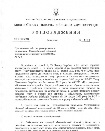16:06 С завтрашнего дня, 25 мая, в будние дни на территории Николаевской области разрешается продажа слабоалкогольных напитков, пива и вина на срок действия военного положения в Украине.