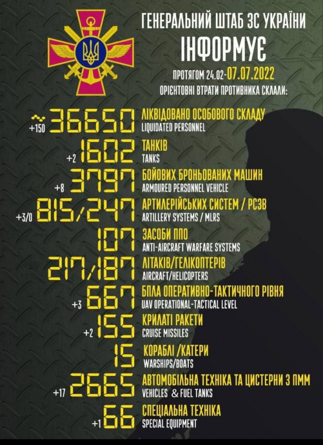 7 июля идут 134-е сутки противостояния украинцев полномасштабному вооруженному вторжению Российской Федерации.