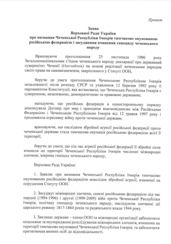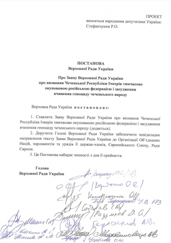 Верховна Рада ухвалила проєкт постанови щодо визнання Чеченської Республіки Ічкерія тимчасово окупованою Російською Федерацією і засудження вчинення геноциду чеченського народу.