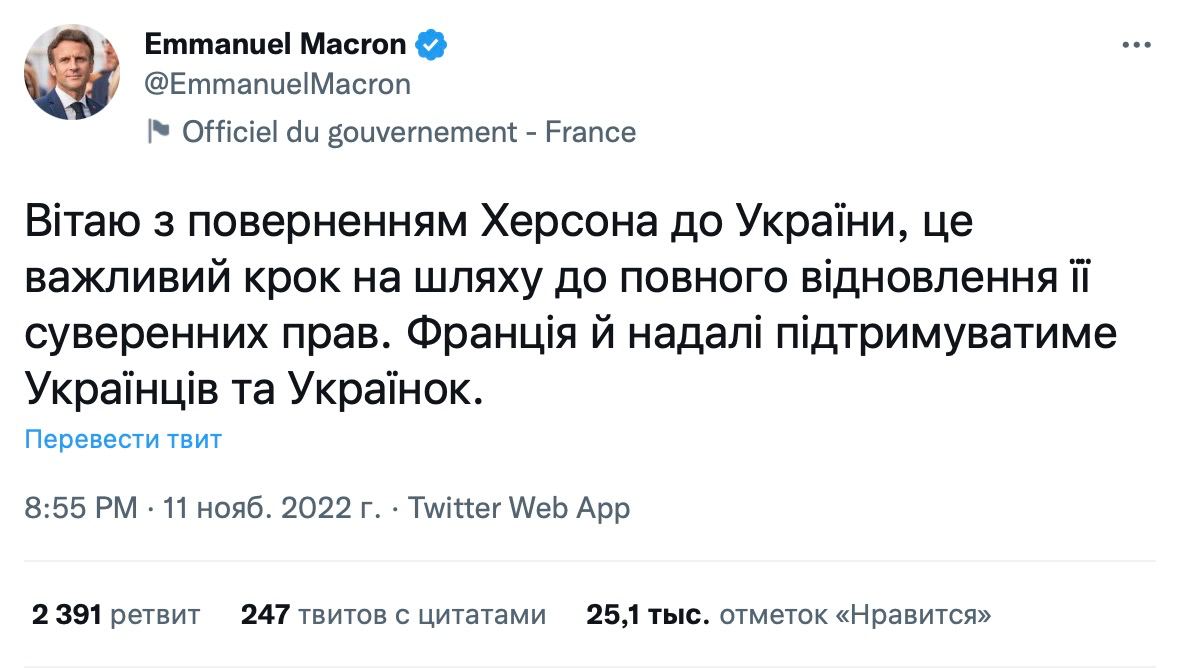 Президент Франції Емманюель Макрон привітав українською мовою у Twitter громадян України зі звільненням від російських окупантів Херсона.