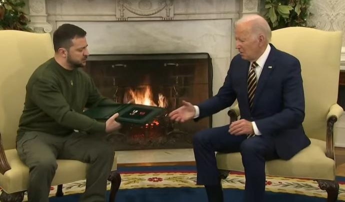 Президент України Володимир Зеленський передав президенту Сполучених Штатів Америки Джозефу Байдену відзнаку «Хрест бойових заслуг» від українського капітана.