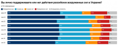 За останній місяць зросла частка опитаних, які підтримують продовження воєнних дій - у травні їх 48% (у квітні - 38%), прихильників переходу до мирних переговорів - 45% (у квітні - 51%). Підтримка переговорів упала до мінімуму.