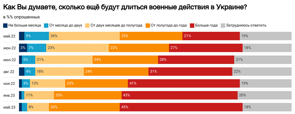 Серед опитаних посилюється впевненість, що війна затягнеться: у травні лише 11% респондентів вважають, що військові дії продовжаться до півроку (у січні – 12%). 71% респондентів вважають, що військові дії триватимуть понад півроку (у січні – 68%).