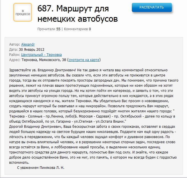 Так, по его мнению, было бы неплохо пустить автобус по такому направлению: "Терновка - Соляные - пр.Ленина, либо(Б. Морская - Садовая) - пр. Октябрьский - далее по кольцу в объезд Октябрьской, по ул. Гагарина - ул. Степная - ул. Остапа Вишни." Ответ на предложение читателя пока ещё не появился.