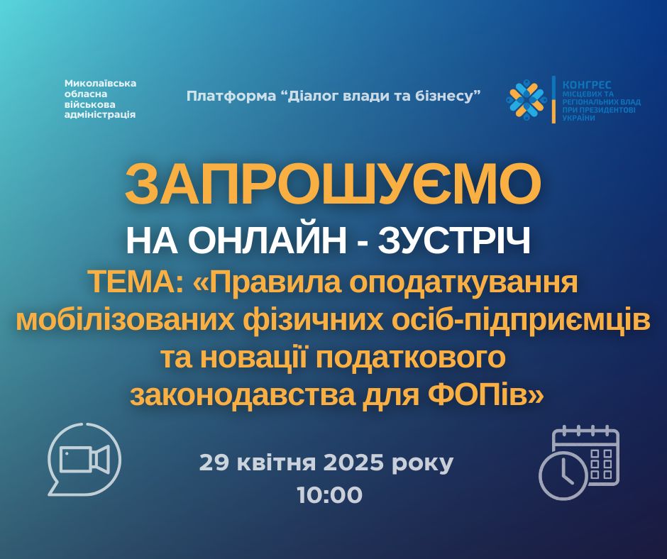 Під час зустрічі ви зможете поставити представникам Головного управління ДПС у Миколаївській області свої питання щодо особливостей оподаткування мобілізованих фізичних осіб-підприємців та новацій податкового законодавства для ФОПів.