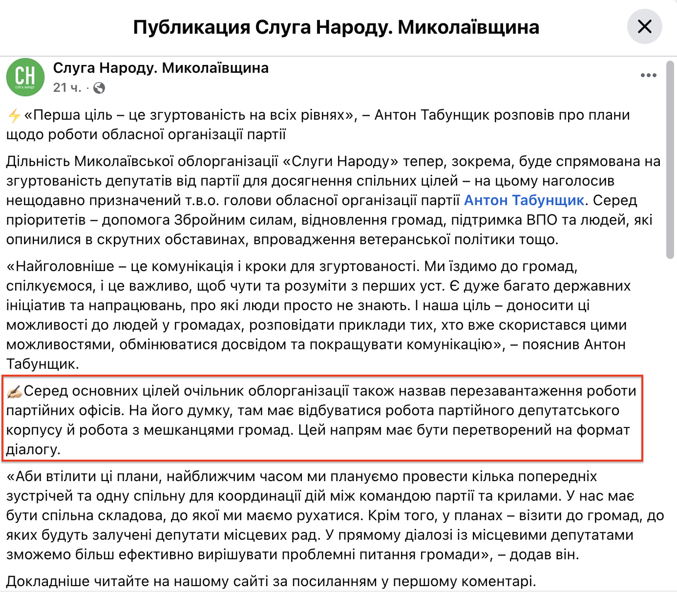 Таку заяву зробила Миколаївська обласна організація партії «Слуга народу», цитуючи слова тимчасово виконуючого обов'язки голови Антона Табунщика.