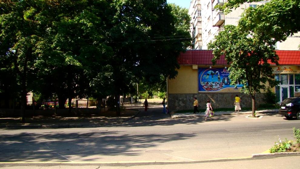 Улица Адмиральская, перед Ингульским мостом. Напротив пиццерии «SanRemo» через дорогу - горбольница № 4, также рядом - Первая украинская гимназия имени Николая Аркаса
