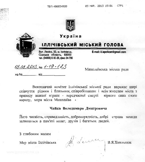 Также в адрес мерии поступили соболезнования от правлений Международного черноморского клуба и Международной Ассамблеи столиц и больших городов стран СНГ. Кроме того, в горисполком поступили телеграммы с соболезнованиями из Харькова и Ильичевска.
