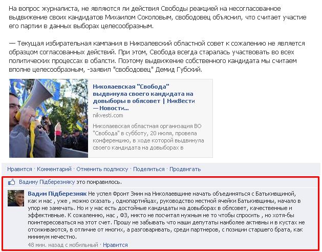 Депутат николаевского областного совета, избранный по списку политической партии «Фронт Змін» Вадим Подберезняк заявил о том, что нынешнее руководство Николаевской областной организации партии ВО «Батьківщина», которую возглавляет Михаил Соколов, в упор не замечает своих новых однопартийцев из числа «фронтовиков».