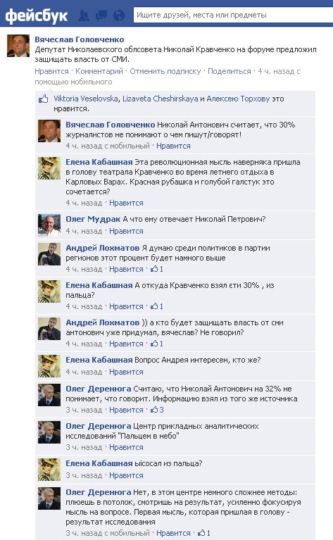 Обсуждая взаимоотношения СМИ и властей, депутат Николаевского областного совета Николай Кравченко выразил необходимость в защите власти от журналистов, о чем на своей странице в Facebook упомянул глава попечительского совета Колледжа прессы и телевидения Вячеслав Головченко.
