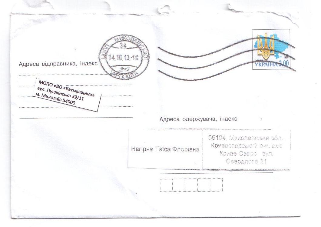 — Я специально выехал по адресу отправителя, указанному на конверте: «Николаев, ул. Пушкинская, 39/11. Ничего, кроме вывески давно выехавшей оттуда фирмы, торговавшей морской солью, там обнаружить не удалось. Зато удалось выяснить, что по этому адресу неделю назад зарегистрирована некая общественная организация «Батьківщина», , - цитирует слова и.о. главы Николаевской областной организации ВО «Батьківщина» Тараса Креминя пресс-служба партии.