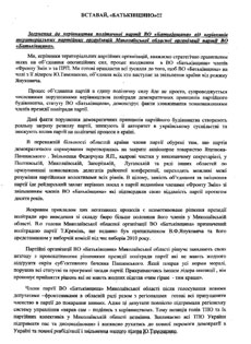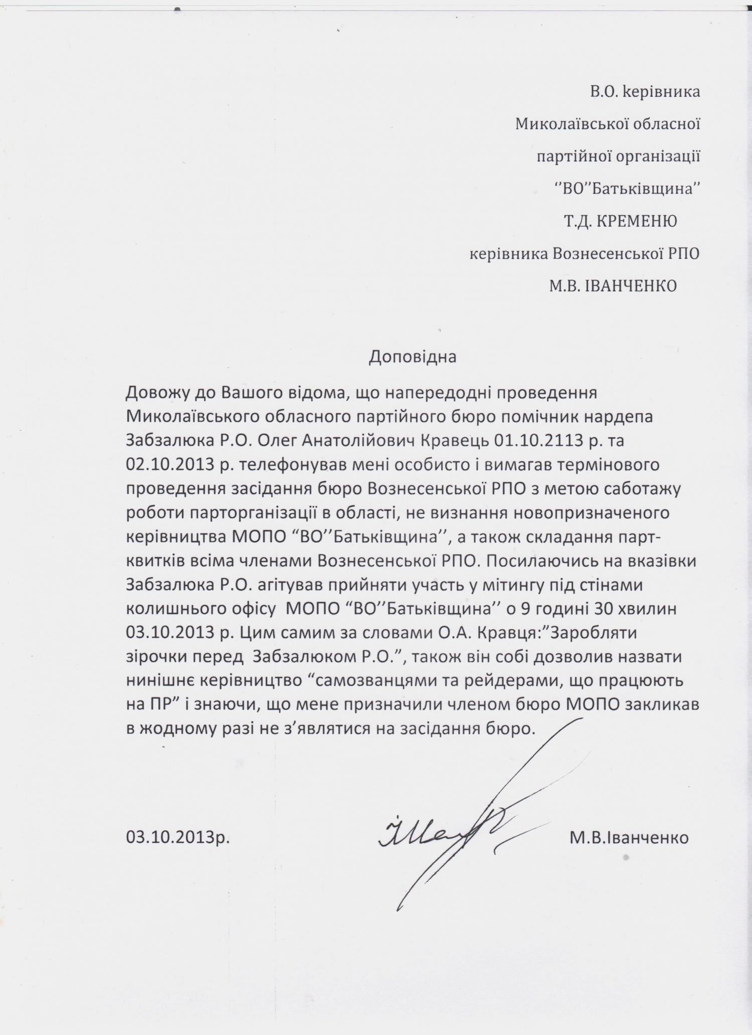 — Ссылаясь на указания Романа Забзалюка, он агитировал принять участие в митинге под стенами бывшего офиса николаевской «Батьківщини», который состоялся 3 октября, тем самым "зарабатывая звездочки перед Романом Забзалюком". Он также позволил себе назвать нынешнее руководство партии «самозванцами и рейдерами, которые работают на Партию регионов» и, зная, что меня назначили членом бюро, призвал ни в коем случае не появлятся на заседаниях, - сказал Максим Иванченко.