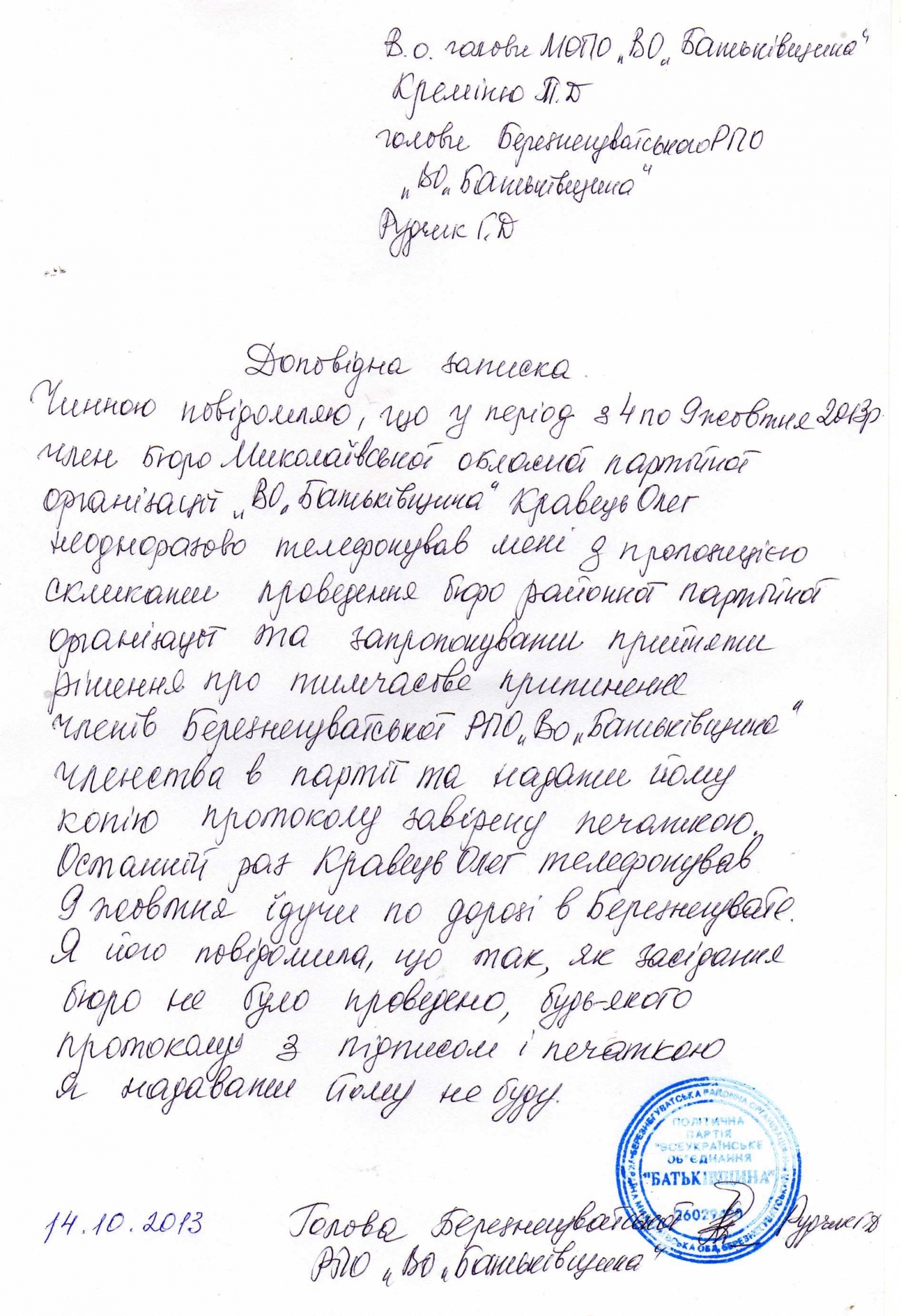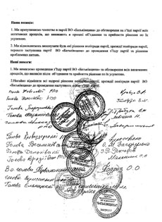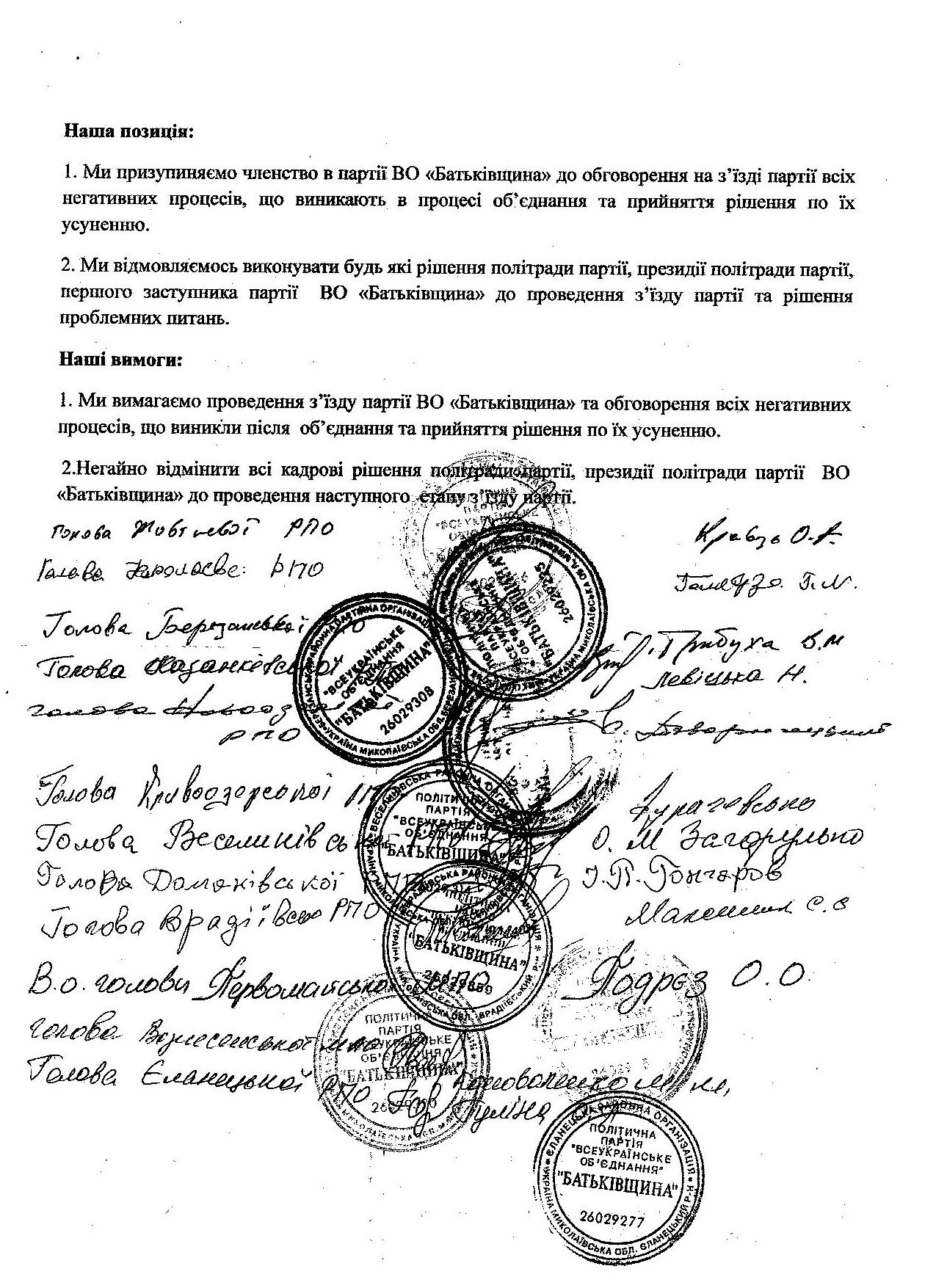 Касательно того, откуда берутся подписи под гневными заявлениями бывших партийцев, рассказывают сами члены ВО «Батьківщина» в Николаевской области. К примеру, руководитель Вознесенской районной организации партии Максим Иванченко рассказал о том, как перед проведением Николаевского областного партийного бюро помощник нардепа Романа Забзалюка Олег Кравец звонил ему и требовал немедленного проведения заседания бюро Вознесенской районной организации с целью саботажа работы парторганизации в области, непризнания новоназначенного руководителя Тараса Креминя, а также сложения партбилетов всеми членами Вознесенской организации партии.