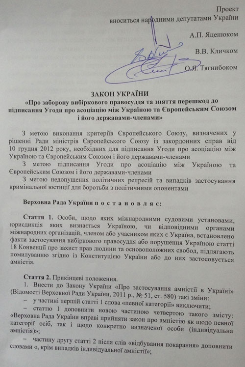 Согласно проекту закона, опубликованного на сайте "Батькивщины", лица, в отношении которых международными судебными инстанциями и соответствующими органами международных организаций установлены факты применения выборочного правосудия или нарушение Украиной статьи 18 Конвенции о защите прав человека и основных свобод, подлежат помилованию согласно Конституции Украины или к ним применяется амнистия.