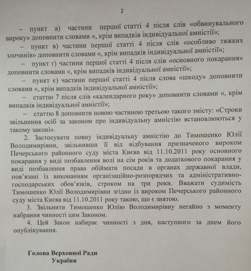 Законопроектом предусматривается применить полную индивидуальную амнистию к Юлии Тимошенко, освободив ее от отбывания 7-летнего срока и дополнительного наказания в виде лишения права занимать должности в органах государственной власти сроком на три года. Кроме того, лидеры оппозиции предлагают считать судимость Тимошенко снятой и освободить ее немедленно с момента вступления в силу закона.