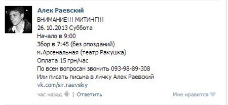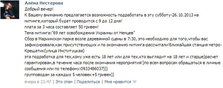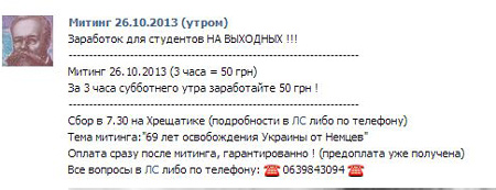 Как известно, в соцсетях проходила широкая кампания по сбору "активистов" на митинг ко дню освобождения Украины от фашистов. Желающим попробовать себя в качестве "антифашиста" предлагали разные способы оплаты, писала Украинская правда.