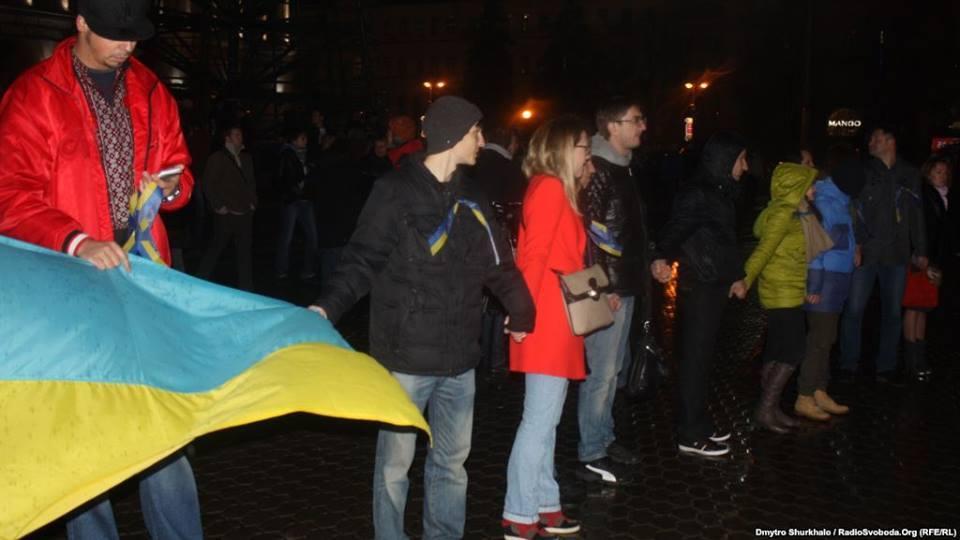 Очевидцы сообщают, что люди сначала выстроились по периметру Майдана и скандировали "Украина - это Европа", "Yes - ЕС!", а затем пели национальный гимн.