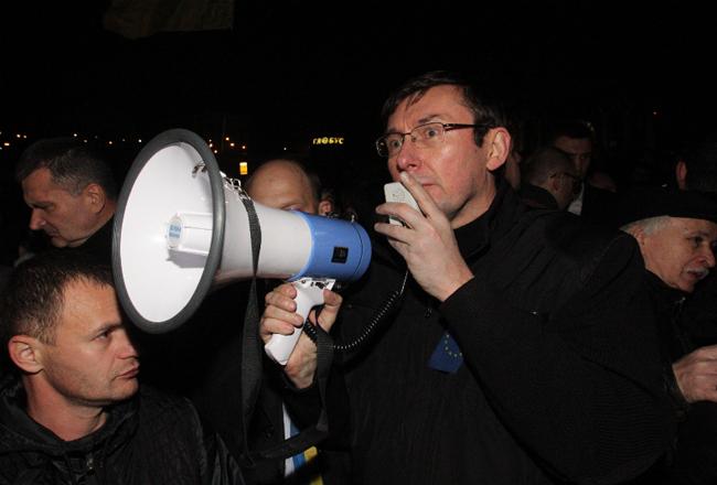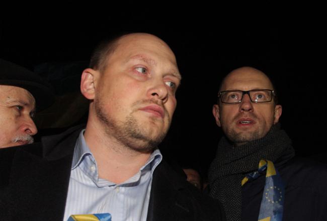 Поддержать украинцев пришли также полиитки, среди которых и лидеры Объединенной оппозиции - Арсений Яценюк, Виталий Кличко, Олег Тягнибок, а также экс-министр внутренних дел Юрий Луценко.