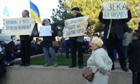В митинге участвуют николаевцы разных возрастов: и молодежь, и пожиылые люди. Отметим, что многие держат в руках плакаты "Зека на Йолку", "Янукович, геть" и другие.