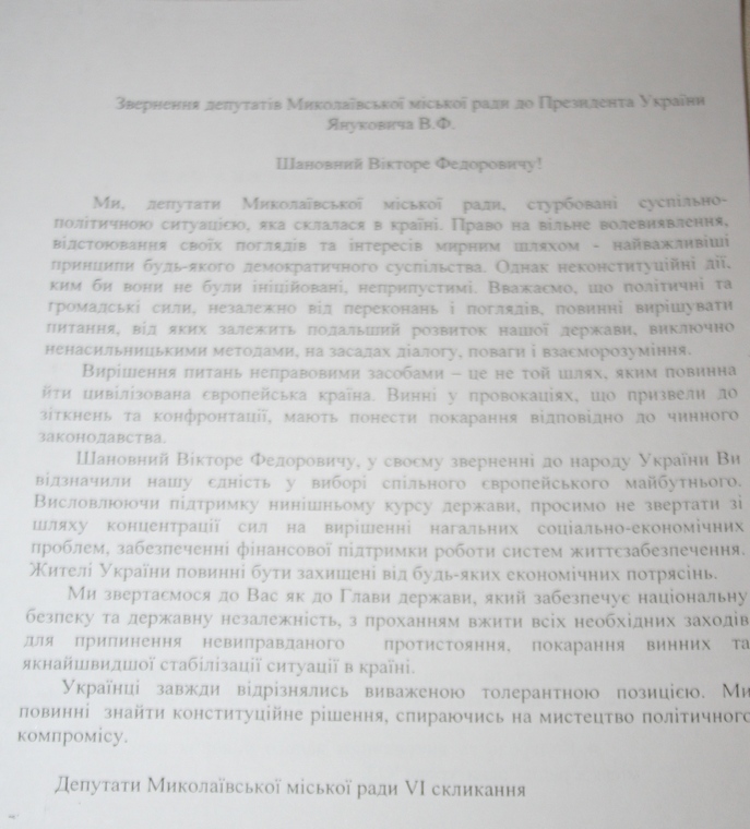 Николаевский городской совет попросил Януковича принять меры для стабилизации ситуации в Украине