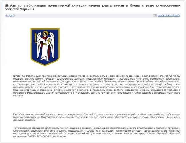 Николаевская областная организация Партии регионов сообщает, что в юго-восточных областях Украины созданы Штабы по стабилизации политической ситуации. В перечне регионов, где уже функционируют штабы, указаны Херсонская, Сумская, Запорожская, Винницкая и Донецкая области.