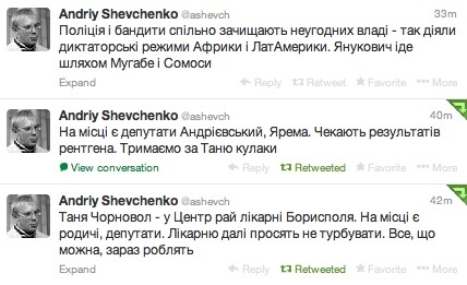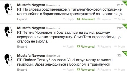 "По словам Татьяны Черновол, она поворачивала к себе в село Гора, когда заметила за собой слежку. Она резко повернула назад в Борисполь. Но машина начала ее прижимать. После чего ее машину несколько раз ударили кузовом. Она остановилась. Из машины выбежали двое, разбили стекло. Она выскочила из машины и попыталась бежать. Ее догнали и били. Били двое мужчин",- написал Мустафа.