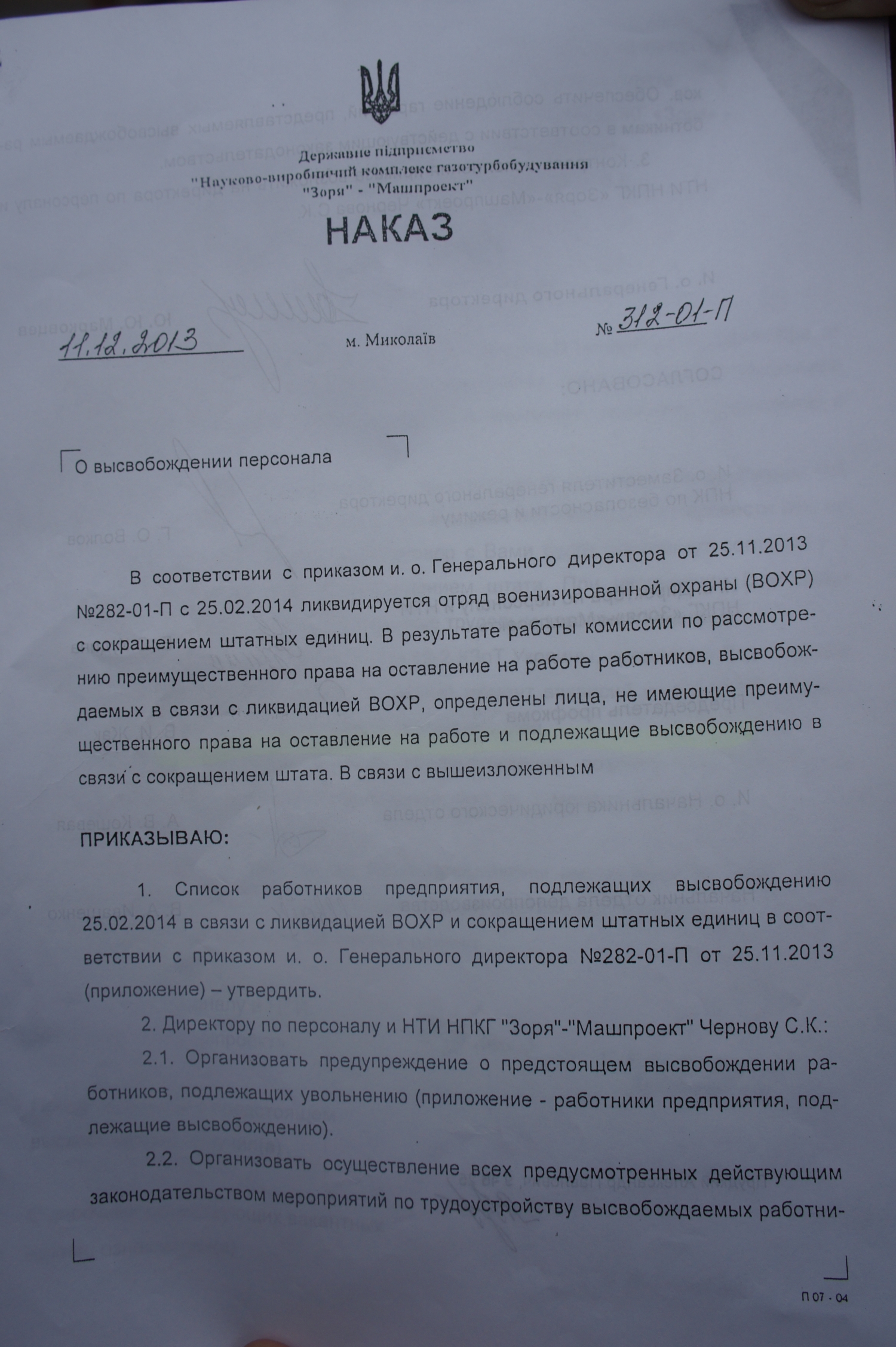 Большинство сотрудников отряда военизированной охраны ГП "Зоря Машпроект", за исключением тех, кто в отпуске и на больничном, обратились с иском в Ленинский районный суд Николаева, чтобы обжаловать и отменить приказ администрации завода о ликвидации отряда и увольнении его штатного персонала.