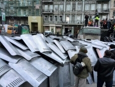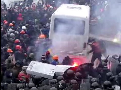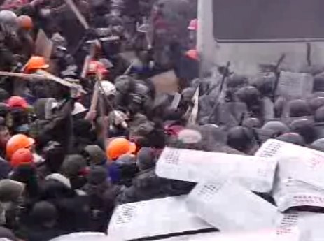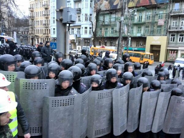 На улице Грушевского, которая перекрыта кордоном внутренних войск, собралось несколько тысяч митингующих с Евромайдана, которые пытаются прорваться в правительственный квартал.