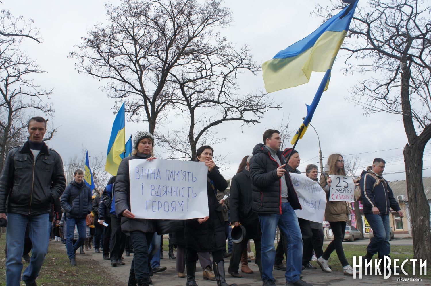 В среду, 19 февраля, в Николаеве более 100 человек приняли участие в траурном шествии памяти погибших в Киеве во время вчерашних и сегодняшних столкновений активистов с силовиками.