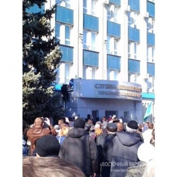 Как сообщает "Восточный вариант", в Луганске сепаратисты около 16:00 часов в воскресенье, 6 апреля, штурмом взяли здание управления СБУ в Луганской области. Толпа выбила двери и ворвалась в здание. Двери буквально снесли.