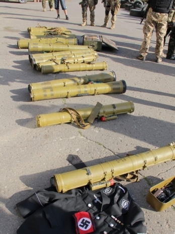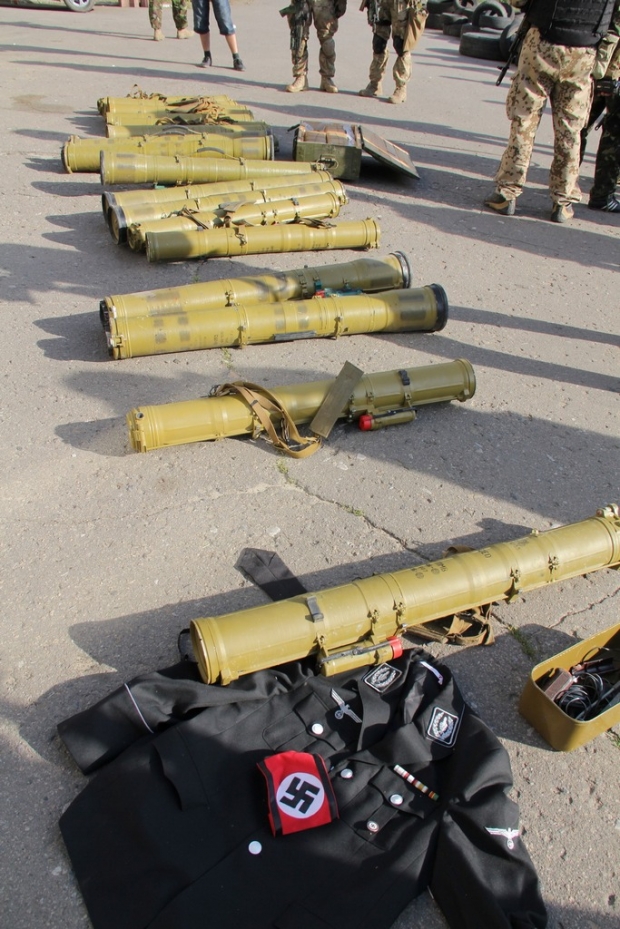 Все вооружение и боеприпасы в основном хранились в подвалах админзданий. В частности, около 100 ящиков боеприпасов для стрелкового оружия (калибр 5,45 и 7,62 мм), несколько ручных противотанковых гранатометов (РПГ-18), один из которых во взведенном состоянии. Большое количество переносных зенитно-ракетных комплексов (ПЗРК) и ночные прицелы. Различного характера обмундирование с шевронами российских «казаков» и нацистских формирований СС.