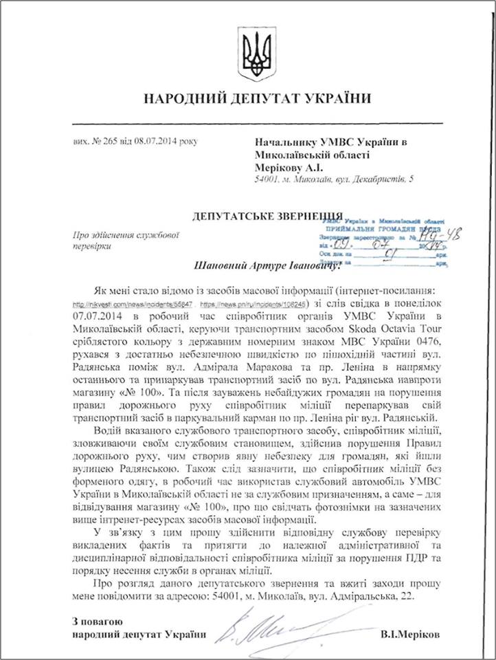 Народный депутат Вадим Мериков обратился к начальнику управления МВД Украины в Николаевской области Артуру Мерикову с просьбой провести соответствующую служебную проверку, а также привлечь к административной и дисциплинарной ответственности сотрудника милиции, который посреди рабочего дня на служебном автомобиле вместе с дамой пронесся на довольно высокой скорости по главной улице города Советской, вопреки запрету передвигаться по ней на транспорте, чуть не сбив людей.