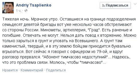 — Тяжелая ночь. Мрачное утро. Оставшиеся на границе подразделения семьдесят девятой бригады вот уже несколько часов обстреливают со стороны России. Минометы, артиллерия, "Град". Есть раненые и погибшие. Отвечать не могут. Нельзя дать повод к вторжению. Можно только зарыться в грунт и уповать на Всевышнего. А грунт там каменистый, твердый, и в эту землю бойцам приходится буквально вгрызаться, - сообщил Андрей Цаплиенко.