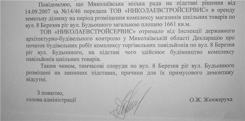 Кроме этого сообщается, что землю под застройку выделили ООО «Николаевстройсервис» на 14 сессии горсовета еще в сентябре 2007 года. Причем в решении сессии говорилось о предоставлении земли для строительства школьных павильонов.