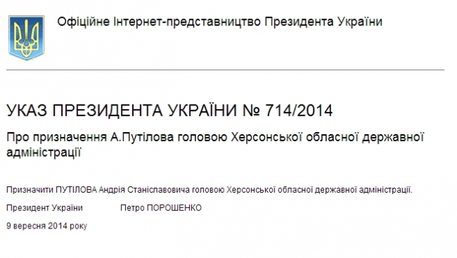 "Назначить Путилова Андрея Станиславовича председателем Херсонской областной государственной администрации", - говорится в документе.