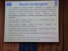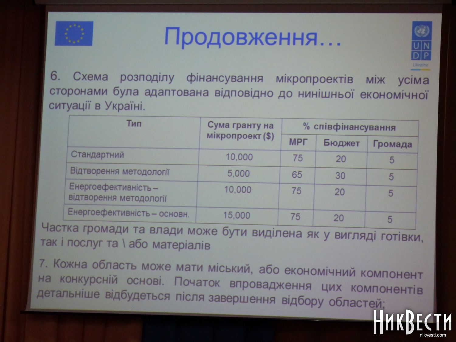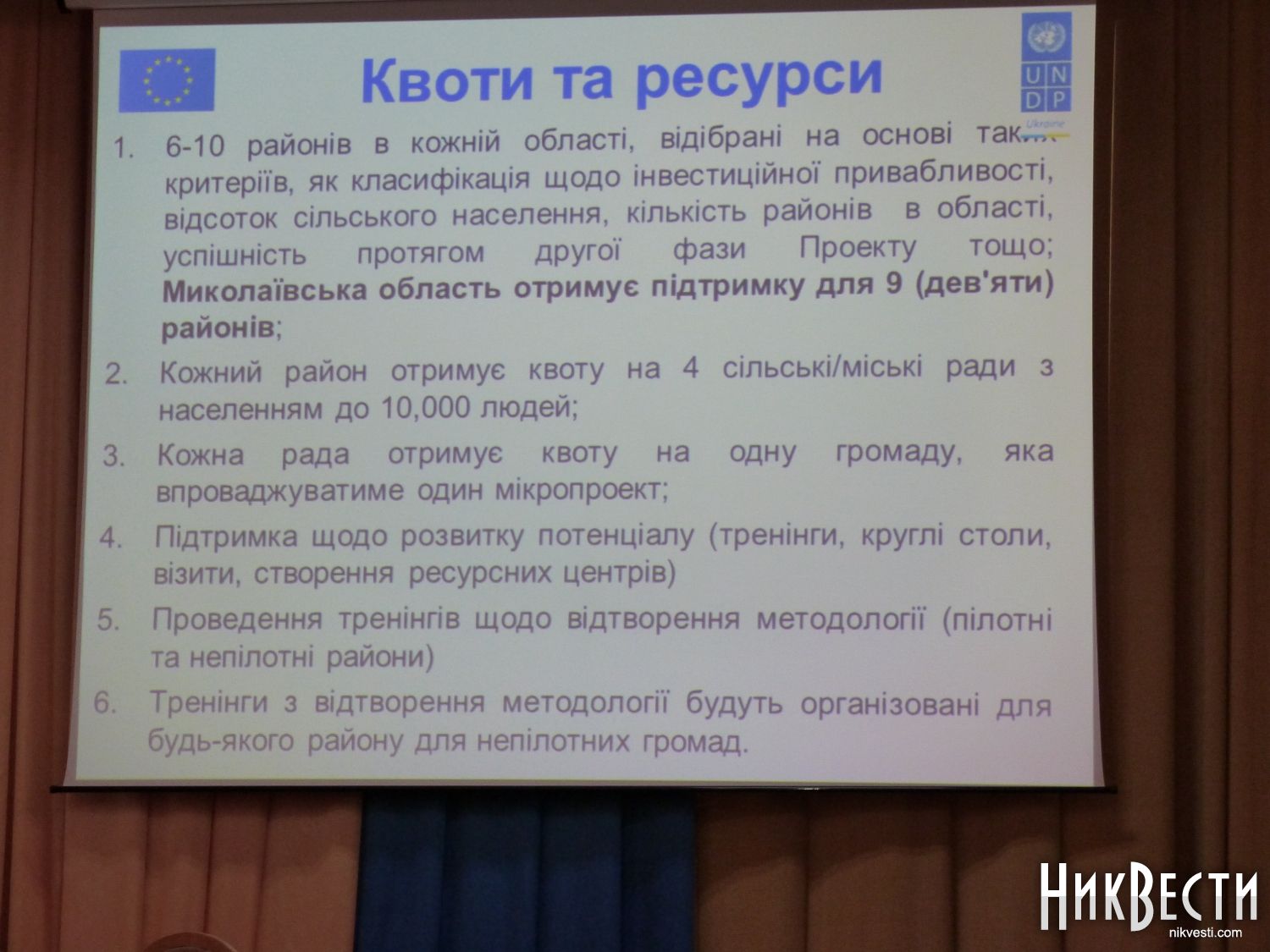 По словам специалиста по развитию общин проекта МРО Елены Рудич, Николаевская область будет представлена в проекте девятью районами. В каждом районе будет отобрано по 4 общины, в которых будут реализованы микропроекты. В общей сложности ЕС предоставит общинам Николаевщины почти полмиллиона долларов.