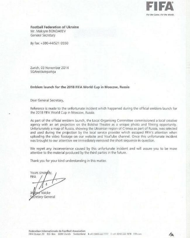 — В рамках презентации официальной эмблемы, Местный организационный комитет поручил местному творческом агентству выполнить художественную проекцию на фасад Большого театра в качестве уникальной возможности для фотосессии и видеосъемки. К сожалению, выбранная и использованная при передаче местным поставщиком услуг карта России, на которой украинский регион - Крым - был показан как часть России, была упущена ФИФА из виду во время загрузки видеоматериала на наш сайт и youtube-канал. Когда этот досадный инцидент был доведен до нашего внимания, мы немедленно изъяли соответствующий короткий видеоряд. Мы сожалеем о неудобствах, вызванных этим досадным инцидентом, и уверяем Вас, что будем в будущем более внимательными к материалам, произведенным третьими сторонами. Спасибо за Ваше понимание этой проблемы, - говорится в письме за подписью генерального секретаря ФИФА Жерома Вальке