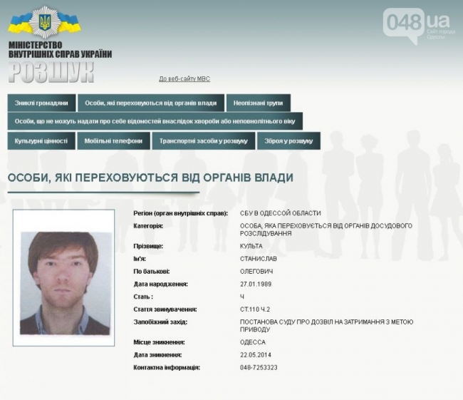 Культа внесен в список людей, которые разыскиваются милицией в связи с событиями 2 мая в Одессе.