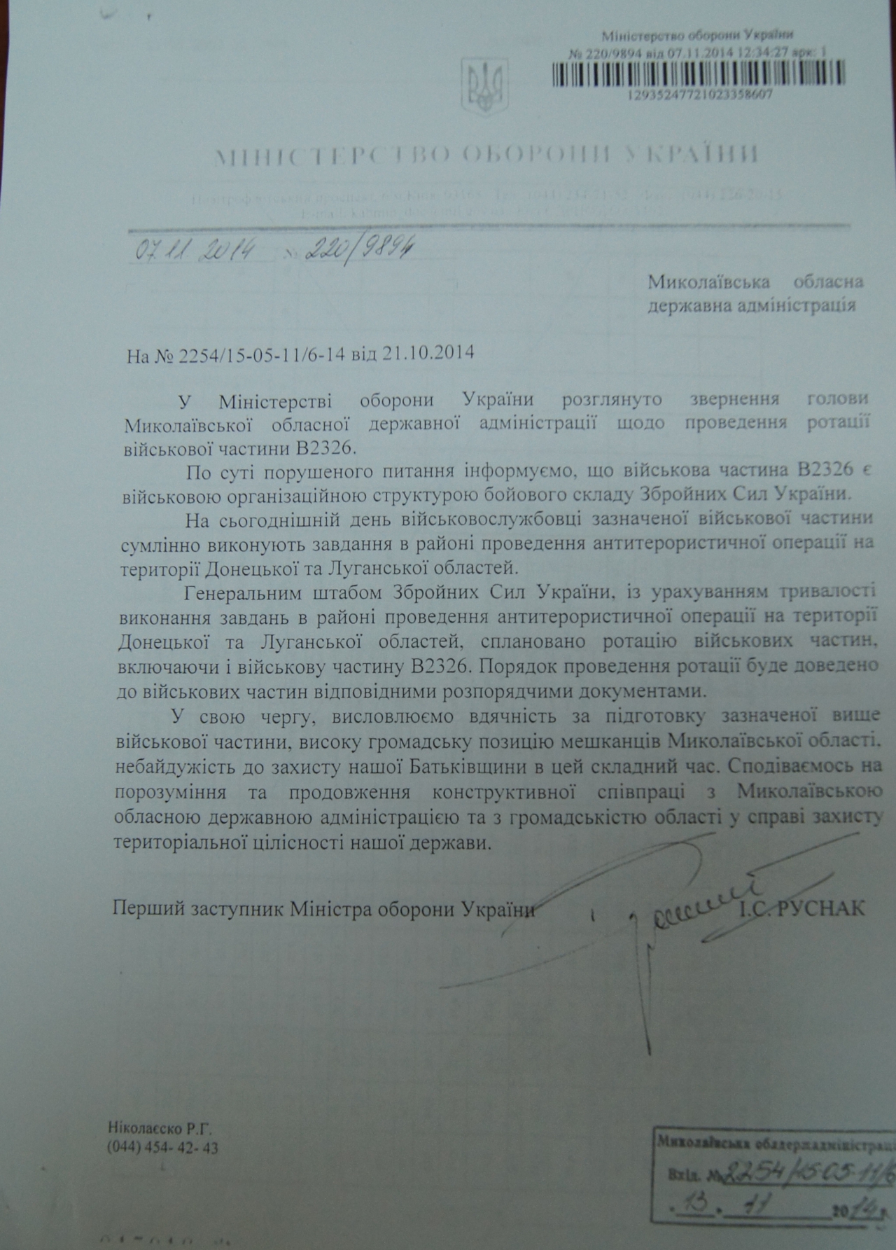 Соответствующее письмо пришло на имя председателя облгосадминистрации Вадима Мерикова от первого заместителя министра обороны Украины Ивана Русака, говорится в сообщении отдела информационно-аналитического обеспечения Николаевской ОГА.